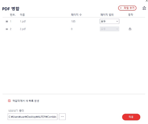 여러 개의 pdf 문서를 하나로 통합한 경우 혹은 필요한 페이지를 추출해서 새로운 파일을 생성 하기위해 알 pdf 합치기 기능을 이용할 수 있습니다.